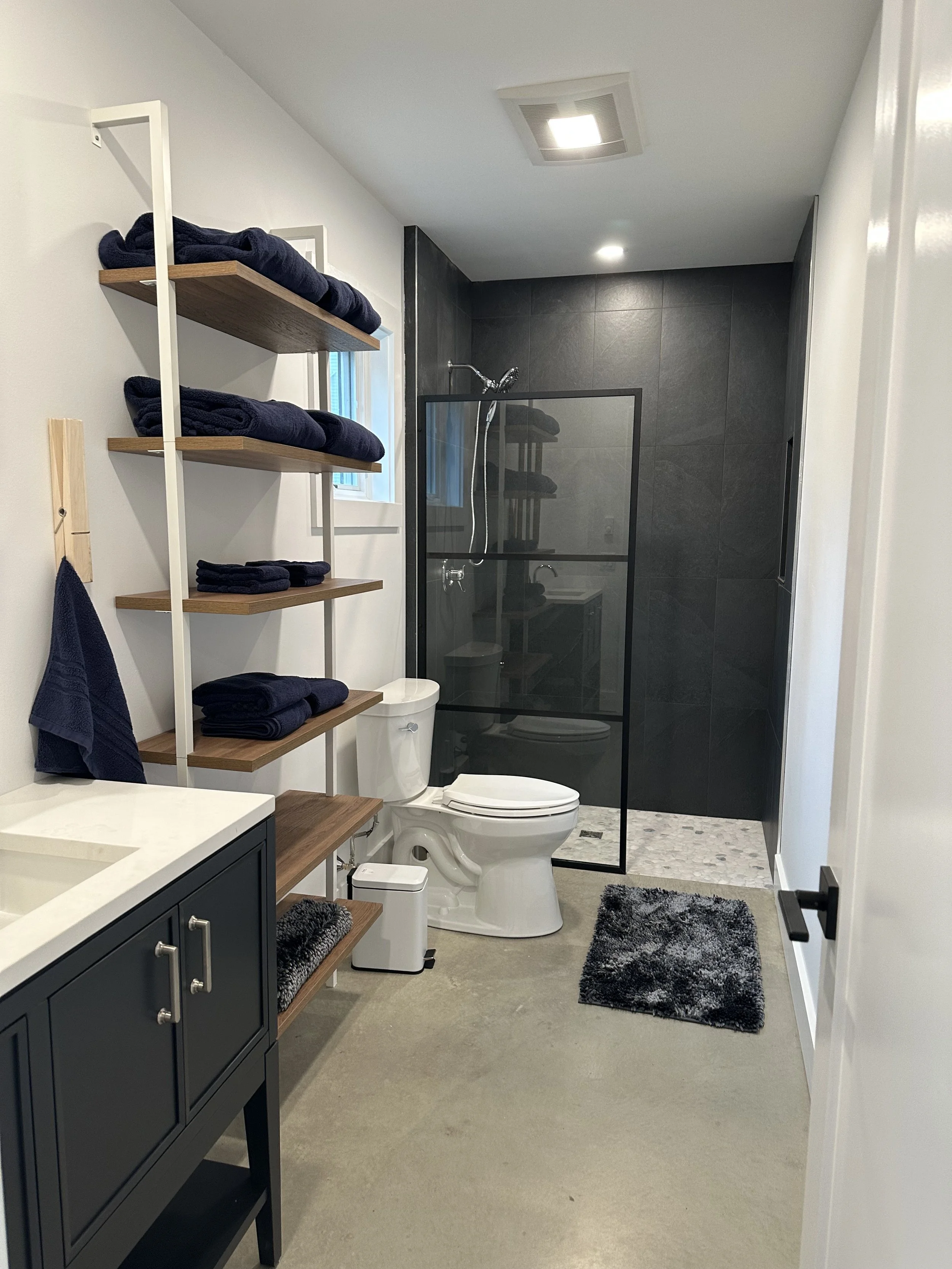 well equipped kitchen spa like bathroom and full size washer/dryer